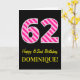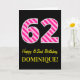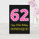 El frente de este divertido y simple diseño de tarjeta de felicitación con tema de cumpleaños presenta un gran número "62" con un patrón de rayas rosa claro y rosa oscuro, junto con el mensaje "Feliz cumpleaños 62" y un nombre personalizable. El fondo de la parte frontal es de color negro. El interior presenta un mensaje de felicitación de cumpleaños personalizado, o quizás podría estar en blanco si se desea escribir un mensaje a mano. Una tarjeta de cumpleaños como esta podría ser una forma divertida de enviar deseos de cumpleaños a alguien que está celebrando su cumpleaños número sesenta y dos.