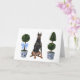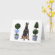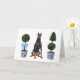 Esta papelería cuenta con un retrato acuático de un perro Doberman Pinscher sentado entre dos topiarios de estilo chinoiserie.