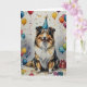 Un ilustracion festivo de un feliz perro pastelero tricolor Shetland con un gorra fiesta azul con acentos dorados. El fondo está lleno de globos coloridos, confetti y regalos envueltos, creando un ambiente alegre y festivo. Las obras de arte presentan un estilo acuático pintado a mano con colores vivos y detalles divertidos.