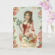 Esta joven está recogiendo y llenando su sombrero con flores de lirio de los valles. El fondo es azul claro y un borde de rosas silvestres rosadas enmarca la escena victoriana.