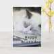 Un gatito lindo del ragdoll duerme en una tarjeta de felicitación de plata del ordenador portátil con feliz cumpleaños en gris.