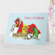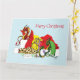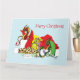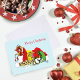 Tres pequeños dragones jugando entre el gorra rojo de Santa, galletas y un vaso de leche en un fondo de azul
