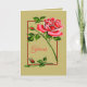 A single, dramatic rose in a bright, slightly stylized realism. The focal bloom sits toward the upper right of the picture: lush, multi-layered petals that graduate from deep rose-red at the center to softer pinks and pale highlights at the edges. A long, arching green stem curves through the composition from lower left to upper right. Two buds accompany the main flower: a partially closed bud near the top left and a much smaller bud near the lower left. A thin rectangular border in a matching red frames the scene.