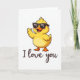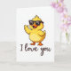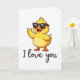 This Valentine’s Day card features a bright, cheerful duckling centered on a white background that keeps the focus on the character and message. The duckling is colored in warm shades of yellow, orange, and brown, with one wing raised in a friendly wave. Black sunglasses give it a confident, stylish look, while a soft blush on its cheek adds warmth and charm. Below the illustration, the words “I love you” appear in flowing dark brown script, creating a strong emotional focal point. The balanced layout and clear details make this card a sweet way to share affection and smiles ❤️