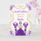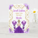 Esta dulce invitación de 16 cumpleaños tiene un marco dorado elegante, una hermosa princesa con el pelo rubio y un vestido morado, flores y un globo.