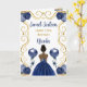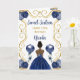 Esta dulce invitación a la tarjeta de 16 años tiene un marco dorado elegante, una bella princesa con piel oscura y un vestido azul marino, flores y un globo.