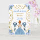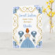 Esta dulce invitación a la tarjeta de dieciséis años tiene un marco dorado elegante, una bella princesa con el pelo rojo y un vestido azul polvoriento, flores y un globo.