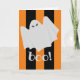 Agrega diversión festiva inesperada a alguien en Halloween con esta tarjeta de felicitación doblada, que presenta un adorable fantasma de dibujos animados que dice "¡boo!". Con un fondo de rayas naranja y negro brillante y moderno tanto en la parte frontal como en la trasera, esta tarjeta seguramente animará la temporada de terror. La tarjeta interior dice "¡Tengan un Halloween espeluznante!" pero puede ser personalizada con su propio texto, si lo desea. Ideal para niños y adultos. ¡Feliz Halloween!