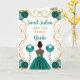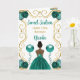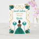 Esta dulce invitación a la tarjeta de 16 años tiene un marco dorado elegante, una bella princesa con piel oscura y un verde azulado vestido azul, flores y un globo.