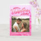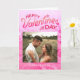 Esta tarjeta de San Valentín presenta una tipografía manuscrita vibrante "Feliz Día de San Valentín" con una foto de una pareja sobre un fondo de peluche rosa. Puedes