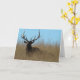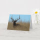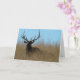Tarjeta de alce de toro en maleza. Una gran alce de toro con enormes cuernos busca un poco de sombra del calor del sol de verano tirada en las altas hierbas secas.
