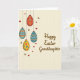 This card features four decorated egg shapes hanging down the left side on dotted strings, creating a sweet, festive scene 🐰. One egg is deep red with small golden floral details, another is teal with red stripes and tiny stars, a third is dark blue with white flower shapes and golden zigzag bands, and the last is sunny yellow with red and blue starbursts. The background is a soft cream tone with faint vertical stripes, giving the colors room to stand out without feeling busy. Small red hearts drift around the eggs, and a few tiny butterflies with golden wings float nearby, like they’re circling a gentle bond between giver and receiver 🌷. On the right side, the greeting “Happy Easter Granddaughter” appears in flowing brown lettering, taking up most of the open space. The text sits centered on the right half, with the words stacked neatly so they feel close and affectionate next to the hanging eggs. The hearts and butterflies are scattered mostly between the eggs and the message, with a few tucked near the top and middle of the design.