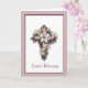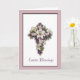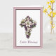 A graceful Easter illustration featuring a decorative cross adorned with blooming white lilies and soft purple flowers, symbols of purity, resurrection, and new life celebrated during Easter. The elegant floral arrangement surrounds the cross with fresh spring beauty, reflecting faith, hope, and the resurrection of Jesus Christ. The gentle pastel tones and detailed botanical elements create a timeless and meaningful design, perfect for a personalized Easter greeting card that shares blessings and the joy of the season.