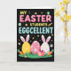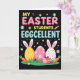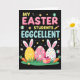 This design shows a digital illustration on a deep black background that mixes classroom pride with spring decorations. Across the top, chunky 3D-style letters spell “MY EASTER STUDENTS EGGCELLENT” in pastel pink, yellow, and aqua, arranged in a wide line near the upper edge. Below, three oversized egg shapes stand close together like friendly classmates, each topped with long bunny ears 🐰. One egg is sunny yellow with white dots, another is pink with white flower shapes and small green speckles, and the third is white with scattered confetti-like dots in many colors. They rise from bright green grass, where slim orange carrots peek out and a small gift box with a tied ribbon sits nearby, adding a sweet, share-and-care feel. Tiny glowing dots and simple flower accents float in the background, while small globe icons and a pencil tucked among the details hint at learning and encouragement 🌷. The rounded pastel headline sits above the trio, and the lower scene is framed by grass, carrots, and the little ribboned present against the dark backdrop.