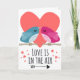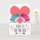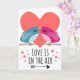 Esta tarjeta de felicitación de San Valentín presenta dos pequeños pájaros de dibujos animados enamorados sentados en sus ramas con un gran corazón rosa en el fondo y algunos corazones diminutos alrededor de la leyenda que dice "el amor está en el aire".