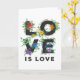 Carta de bienvenida con el orgullo LOVE IS LOVE escrita en negritas letras negras decoradas con vegetación, bayas y flores en rojo, naranja, amarillo, verde, azul y violeta, inspirada en los colores de la bandera arcoiris.
