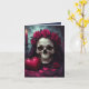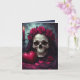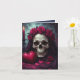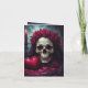 Un cráneo llamativo descansa serenamente bajo una capucha de terciopelo, sus ojos huecos captando el cálido y tembloroso resplandor de una sola vela. Una corona de rosas rojas profundas corona el hueso. Junto a él, una caja en forma de corazón descansa entre pétalos de rosa dispersos, una armonía de romance y ruina. La paleta es suntuosa y dramática: magentas y burgundios de rosa sangre contrastan con negros de medianoche y toques de azul teñido de humo. El diseño se siente vivo a pesar de su macabro tema. La luz de la vela proyecta sombras largas y danzantes, convirtiendo la decadencia en elegancia.