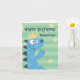 Una tarjeta de cumpleaños linda con un tema del dinosaurio, características del este diseño un dinosaurio azul grande de T-Rex que lleva una corona del cumpleaños. Un fondo de rayas verdes y confeti y las estrellas amarillos añade color y la diversión al diseño. Personalice con el nombre de su niño. El texto interior se puede también personalizar con su fraseología deseada.