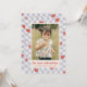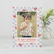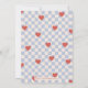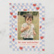 Una tarjeta El día de San Valentín festiva con corazones rojos dispersos en un brillante diseño de tablero azul. El mensaje y la información del cliente se colocan debajo de una gran foto, y la parte posterior de la tarjeta presenta un patrón de coordinación.