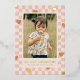 Una carta El día de San Valentín Relieve metalizado con corazones marrones esparcidos por un diseño de tablero de ajedrez rosa. El mensaje y la información del cliente se colocan debajo de una gran foto, y la parte posterior de la tarjeta presenta un patrón de coordinación.