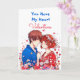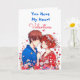 Una tarjeta dulce El día de San Valentín que representa a un anime y a un chica abrazándose. En la parte posterior hay una página de color donde puede personalizar los nombres.