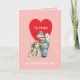Tarjeta de felicitación vintage rediseñada como tarjeta El día de San Valentín para Nana. Se ha agregado un color de fondo con texto, incluida una huella de pata. Una joven chica con traje de nieve azul sosteniendo una tarjeta al lado de su perro frente a un corazón rojo. El verso en el interior dice - ¡Muchos abrazos y besos!