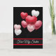La tarjeta de el día de San Valentín para una hermana especial en su vida se muestra con un fondo negro y globos en forma de rojo, rosa y corazón blanco bonito. Personalizar esta tarjeta o compra como está. La tarjeta tiene un mensaje especial dentro.