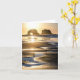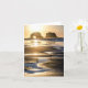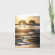 Un notecard en blanco que muestra la playa de Rockaway, Oregon y una puesta del sol hermosa de las rocas del gemelo.