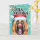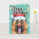 Un gracioso y lindo ilustracion acuarela de un perro de Briard con un sombrero rojo de Santa, alineado con falso piel blanca, con tonos de alambre y una nariz roja de reno. Está enredado en las luces de árbol de Navidad y está enmarcado por largas cadenas verticales y un fondo azul verde azulado encima de las palabras, pulgas navidog. El interior dice "feliz cumpleaños". Ideal para los deseos de fin de año para los clientes o como una adorable tarjeta de vacaciones para amigos y familia.