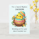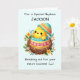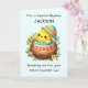 Celebra la primera Pascua de tu sobrino con un toque personalizado que hace que esta carta sea extra especial! Con una achicharrada preciosa que se libera de su caparazón, rodeada de alegres flores de primavera, el diseño capta la alegría y la maravilla de la temporada. El suave fondo verde azulado pastel le da un ambiente fresco y animado, perfecto para marcar este hito. Añadir su nombre al frente crea un recuerdo único para recordar su primera Pascua. En su interior, un mensaje sincero extiende los mejores deseos de un día lleno de amor, alegría y recuerdos inolvidables.