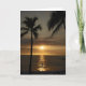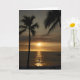Una tarjeta en blanco de bonito con una fotografía de la puesta de sol tropical en la playa, y el rayo de sol que cruza el océano pone de relieve a un surfista para tomar una última ola. Foto de Rebecca Reeder.