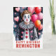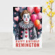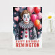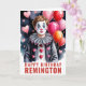 A dreamy and expressive illustration featuring a pastel-haired Pierrot clown dressed in classic black-and-white attire with romantic red heart accents. The character’s gentle makeup, soft gaze, and ruffled collar add a tender theatrical charm. Surrounded by floating hearts and glossy balloons, the artwork blends whimsy with elegance to create a magical birthday scene. The bold red lettering “Happy Birthday Remington” completes this unique and artistic birthday card, perfect for lovers of fantasy clowns and emotional, storybook-style artwork.