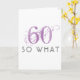 Elegante 60 Así que qué graciosa tarjeta rosada 60 de cumpleaños. Una cita graciosa tengo 60 años, así que qué en los colores modernos rosa y gris. Perfecto para una persona con sentido del humor. Agrega tu mensaje dentro o borra. También se puede cambiar la edad en la parte delantera y en la parte trasera.