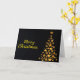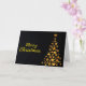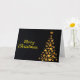 Haga una declaración audaz con esta elegante tarjeta "Feliz Navidad" que incluye un árbol de Navidad dorado en un elegante fondo negro, perfecto para un sofisticado mensaje de vacaciones.