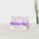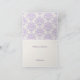 Tarjeta bonita para agradecer después de una boda o una fiesta de compromiso, con un patrón de damasco en lavanda y marfil arriba y marfil sólido abajo. La parte delantera de la tarjeta está decorada con una cinta de lavanda y un lazo. El texto en color lavanda oscuro es totalmente personalizable. Es ideal para enviar agradecimientos después de una boda o una fiesta de compromiso.