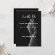 Haz una declaración audaz y elegante con esta tarjeta de save-the-date que presenta un fondo negro elegante y letras blancas crujientes. El diseño de alto contraste emana sofisticación, perfecto para eventos de etiqueta, celebraciones modernas o temas de boda contemporáneos. Su estilo minimalista asegura que los detalles de tu boda sean claros y cautivadores, preparando el escenario para un evento inolvidable. Totalmente personalizable para adaptarse a tu visión única, esta tarjeta es una forma elegante y memorable de anunciar tu día especial.