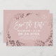 Esta elegante tarjeta de "save the date" de boda en rosa y dorado es perfecta para una boda elegante. El diseño presenta un impresionante marco de hojas con lámina de falso dorado rosa sobre un fondo rosa suave y está combinado con una fuente cursiva deslumbrante. Personalice el anuncio con los nombres de la pareja, la fecha de la boda, la ubicación y el sitio web de la boda.