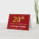 La parte delantera de este elegante y elegante diseño de tarjetas de felicitación con temática de cumpleaños tiene un gran número ordinal "20" con un aspecto falso/imitación de oro inspirado en el oro, el mensaje "FELIZ 20 cumpleaños", un nombre del destinatario del personalizable, y un patrón de borde compuesto de líneas delgadas en un fondo de color rojo. El interior presenta un mensaje de bienvenida de cumpleaños de personalizado, o tal vez podría ser borrado y dejado en blanco si se va a escribir un mensaje a mano. Una tarjeta de felicitación de cumpleaños editable como esta podría ser una manera elegante de enviar deseos de cumpleaños a alguien que está celebrando su vigésimo cumpleaños. [~Z0000467]