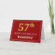 En la parte delantera de este elegante y elegante diseño de tarjetas de felicitación temática de cumpleaños aparece un gran número ordinal "57th" con un aspecto inspirado en el oro de imitación/imitación, el mensaje "HAPPY 57TH BIRTHDAY", un nombre de destinatario personalizado, y un patrón de borde formado por líneas delgadas en un fondo de color rojo. El interior presenta un mensaje de bienvenida de cumpleaños personalizado, o tal vez podría ser borrado y dejado en blanco si se va a escribir un mensaje a mano. Una tarjeta de felicitación personalizada de cumpleaños como esta podría ser una manera elegante de enviar un mensaje de felicitación de cumpleaños a alguien que está celebrando su cumpleaños número cincuenta y siete. [~Z0000467]