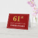 La parte delantera de este lujoso y elegante diseño de tarjetas temáticas de felicitación por cumpleaños cuenta con un gran número ordinal "61st" con una apariencia inspirada en el oro de imitación/imitación, el mensaje "HAPPY 61ST BIRTHDAY", un nombre de destinatario personalizado, y un patrón de borde formado por líneas delgadas en un fondo de color rojo. El interior presenta un mensaje de bienvenida de cumpleaños editable, o tal vez podría ser borrado y dejado en blanco si se va a escribir un mensaje a mano. Una tarjeta de felicitación personalizada de cumpleaños como esta podría ser una manera elegante de enviar saludos de cumpleaños a alguien que está celebrando su sexagésimo primer cumpleaños. [~Z0000467]