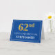 La parte delantera de este elegante y elegante diseño de tarjetas de felicitación de cumpleaños incluye un gran número ordinal "62nd" con un aspecto falso/imitación de oro inspirado en el oro, el mensaje "HAPPY 62ND BIRTHDAY", un nombre de destinatario personalizado, y un patrón de borde compuesto por líneas delgadas sobre un fondo de color azul. El interior presenta un mensaje de bienvenida de cumpleaños editable, o tal vez podría ser borrado y dejado en blanco si se va a escribir un mensaje a mano. Una tarjeta de felicitación personalizada de cumpleaños como esta podría ser usada para reconocer el cumpleaños sesenta y dos de alguien. [~Z0000482]