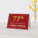 La parte delantera de este elegante y lujoso diseño de tarjetas de felicitación temáticas de cumpleaños tiene un gran número ordinal "77th" con un aspecto falso/imitación de oro inspirado en el oro, el mensaje "HAPPY 77TH BIRTHDAY", un nombre de destinatario personalizado, y un patrón fronterizo consistente en líneas delgadas sobre un fondo de color rojo. El interior presenta un mensaje de bienvenida de cumpleaños personalizado, o tal vez podría ser borrado y dejado en blanco si se va a escribir un mensaje a mano. Una tarjeta de felicitación personalizada de cumpleaños como esta podría ser una manera elegante de dar saludos de cumpleaños a alguien que está celebrando su cumpleaños setenta y siete. [~Z0000467]