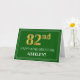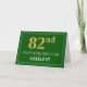 La parte delantera de este elegante y respetable diseño de tarjetas de felicitación con temática de cumpleaños incluye un gran número ordinal "82nd" con un aspecto inspirado en el oro de imitación/imitación, el mensaje "FELIZ 82º BIRTHDAY", un nombre de destinatario personalizado, y un patrón de borde compuesto de líneas delgadas en un fondo de color verde. El interior presenta un mensaje de bienvenida de cumpleaños personalizado, o tal vez podría ser borrado y dejado en blanco si se va a escribir un mensaje a mano. Una tarjeta de felicitación de cumpleaños editable como esta podría ser enviada para celebrar el cumpleaños ochenta y dos de alguien. [~Z0000481]