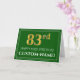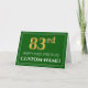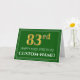 La parte delantera de este lujoso y respetable diseño de tarjetas de felicitación de cumpleaños incluye un gran número ordinal "83" que tiene una apariencia falsa/imitación de oro, el mensaje "FELIZ 83º CUMPLEAÑOS", un nombre editable del destinatario, y un patrón de borde que consiste en líneas delgadas en un fondo de color verde. El interior presenta un mensaje de bienvenida de cumpleaños de personalizado, o tal vez podría ser borrado y dejado en blanco si se va a escribir un mensaje a mano. Una tarjeta de felicitación personalizada de cumpleaños como esta podría ser una manera elegante de enviar un mensaje de felicitación de cumpleaños a alguien que está celebrando su cumpleaños número ochenta y tres. [~Z0000481]