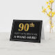 La parte delantera de este elegante y respetable diseño de tarjetas de felicitación temáticas de cumpleaños tiene un gran número ordinal "90" con un aspecto falso/imitación de oro inspirado en el oro, el mensaje "FELIZ 90 BIRTHDAY", un nombre editable del destinatario, y un patrón de borde compuesto de líneas delgadas en un fondo de color negro. El interior presenta un mensaje de bienvenida de cumpleaños de personalizado, o tal vez podría ser borrado y dejado en blanco si se va a escribir un mensaje a mano. Una tarjeta de felicitación de cumpleaños personalizada como esta podría ser una manera elegante de dar saludos de cumpleaños a alguien que está celebrando su cumpleaños número noventa. [~Z0000464]