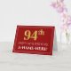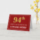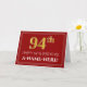 La parte delantera de este lujoso y respetable diseño de tarjetas de felicitación con temática de cumpleaños cuenta con un gran número ordinal "94th" con un aspecto falso/imitación de oro inspirado en el oro, el mensaje "HAPPY 94TH BIRTHDAY", un nombre de destinatario personalizado, y un patrón de frontera consistente en líneas delgadas en un fondo de color rojo. El interior presenta un mensaje de bienvenida de cumpleaños de personalizado, o tal vez podría ser borrado y dejado en blanco si se va a escribir un mensaje a mano. Una tarjeta de felicitación personalizada de cumpleaños como esta podría ser una manera elegante de enviar un mensaje de felicitación de cumpleaños a alguien que está celebrando su cumpleaños noventa y cuatro. [~Z0000467]