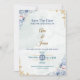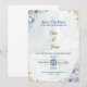 Invite a sus invitados a marcar sus calendarios con esta elegante tarjeta de "Save the Date" con flores de acuarela azul suave, esquinas ornamentales doradas y tipografía moderna. Ideal para temas de boda clásicos o románticos. Personalice con sus nombres, fecha y ubicación de manera fácil.