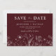 Anuncie su próxima celebración con estilo atemporal con esta tarjeta de "Save the Date" floral elegante burgundy. Con flores burgundy profundas y tipografía moderna refinada, este diseño establece el tono perfecto para una boda romántica. Agregue nombres y detalles del evento para personalizar completamente su tarjeta. Impreso en cartulina premium, combina perfectamente con el conjunto de invitaciones a juego.