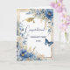 Celebre este hito con una tarjeta de graduación de diseño bonito, personalizada con el nombre y el año del graduado. Flores azules exuberantes con centros con detalles dorados, emparejadas con suaves flores beige, crean un aspecto elegante y atemporal. Delicadas hojas verdes y doradas le dan un toque natural, mientras que un marco dorado geométrico refinado aporta equilibrio y sofisticación. Un fondo acuático suave en tonos azules y beige tranquilizantes realza la serenidad y la sensación de ascenso. Completando el diseño, una mariposa azul bellamente detallada en el lado derecho agrega un acento caprichoso y elegante, que simboliza el crecimiento, la transformación y los nuevos comienzos.
