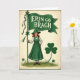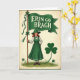 Designed with a classic poster look, the card shows a smiling young woman in a rich green dress standing on a small patch of grass, her posture proud yet friendly 💚. She wears a wide-brimmed green hat over softly curled red hair, with a white blouse and a small green bow that draws your eye to her calm, inviting face. In her hands, she holds a tall wooden pole topped with a flowing emerald banner that stretches above her like a canopy. Across the banner, the words “ERIN GO BRAGH” sit in white lettering, centered and easy to read against the deep green. A large shamrock with a long, curling stem rises on her right side, while tiny three-leaf clovers sprinkle the ground around her ☘️. The warm cream background and dark green border frame the scene, giving it a cozy, old-fashioned feel, like a keepsake you’d pass to a close friend. Small ribbons tied near the top of the pole and the neat folds in her skirt add fine detail against the cream backdrop and green frame.